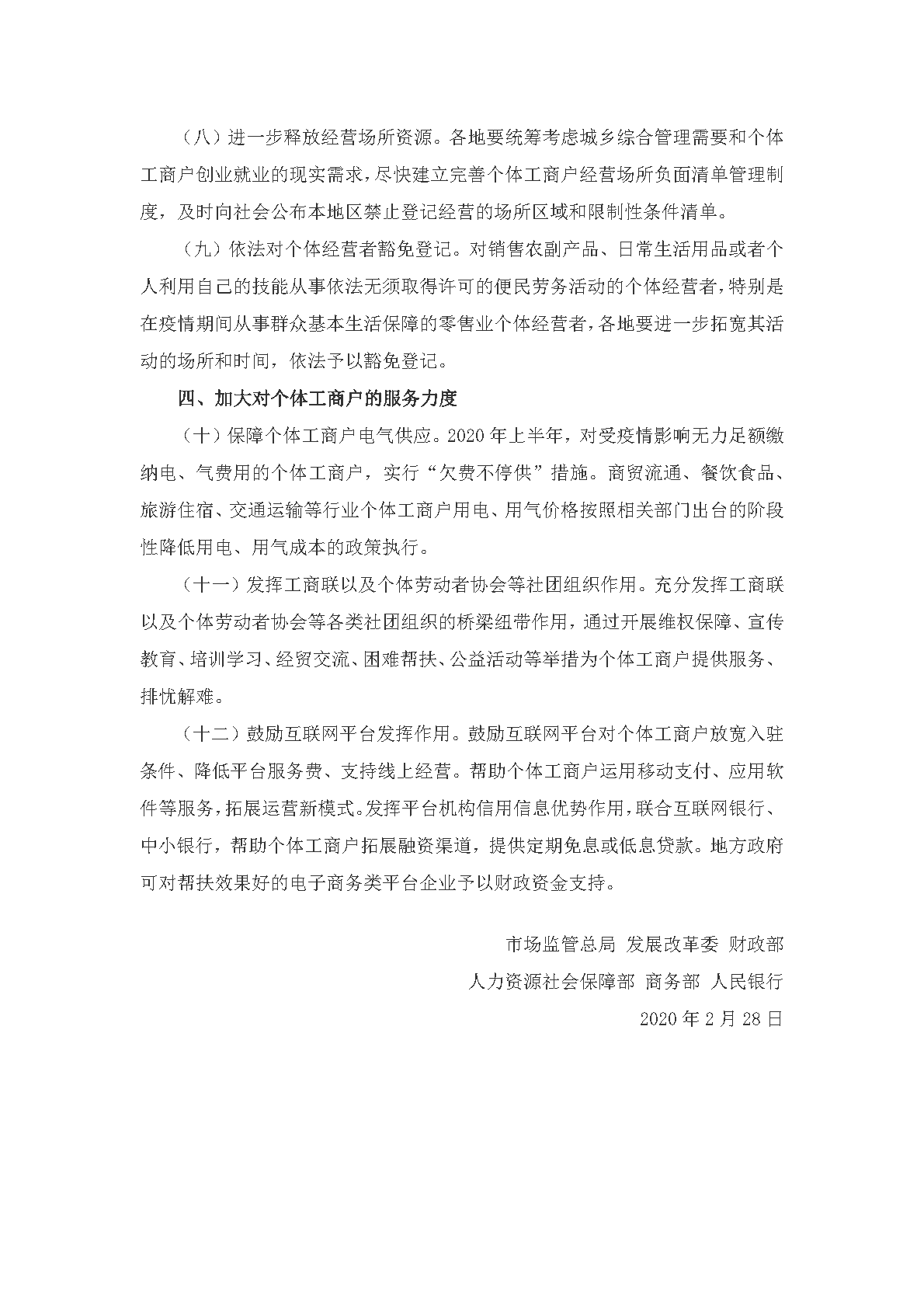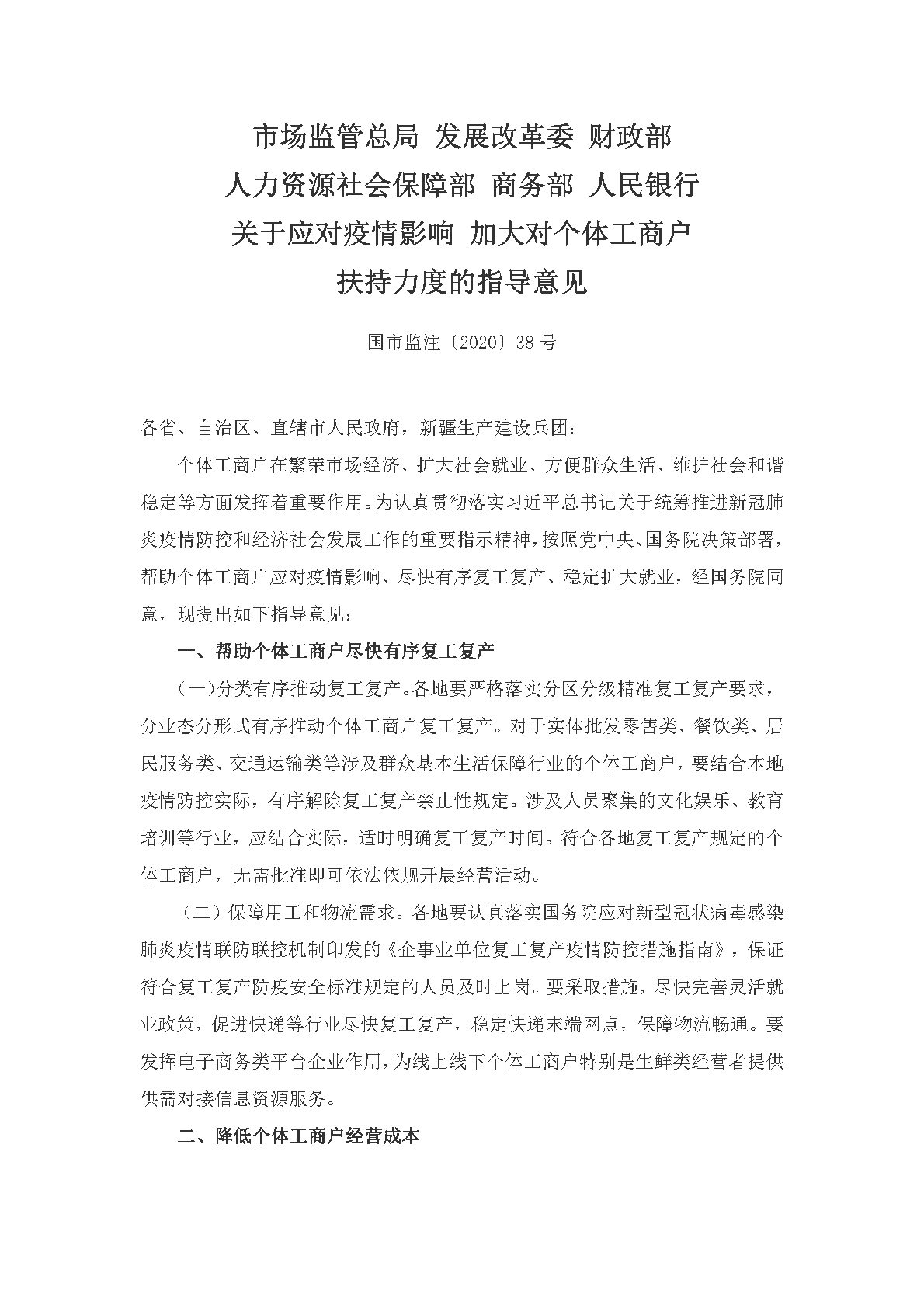 市场监管总局 发展改革委 财政部 人力资源社会保障部 商务部 人民银行 关于应对疫情影响 加大对个体工商户 扶持力度的指导意见